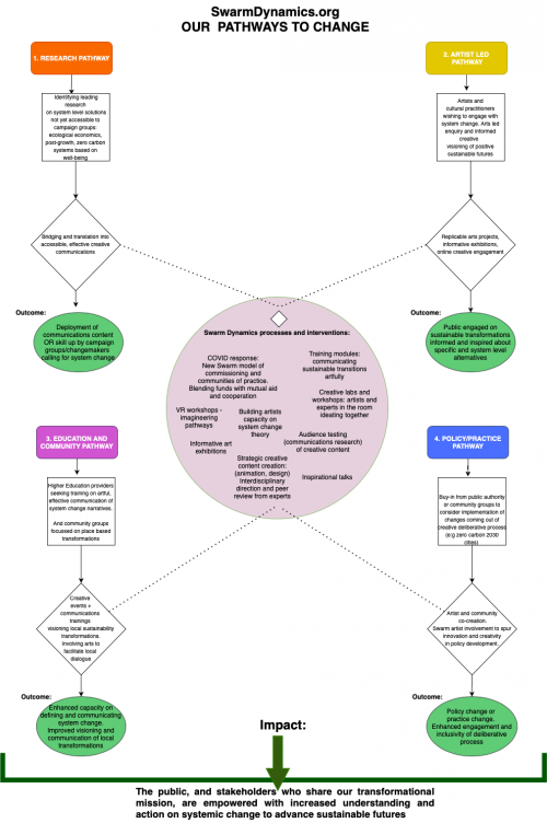 In pursuit of our purpose, all our work falls within one or more of the 4 pathways to change we have developed: a research pathway, an artist led pathway, an educational and community pathway, and a policy/practice pathway. To explore the below diagram in larger form, hover the mouse over it or click here to open as pdf: Pathways to Change Diagram