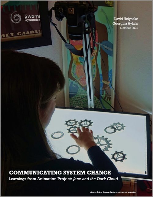 Green New Deal Reloaded is a new project led by Swarm Dynamics in 2021 and 2022, generating informative, artful creative content to communicate to wider audiences how an ambitious Green New Deal in the UK could drive system change – beyond the current growth addicted economic model. Involving experts in capacity building for campaign partners with national reach, the project is made possible by support from the Poldam Puckham Foundation. The first animated film was release in late October and rated 4.5 stars by Films for Action. The films was trending on Films for Action during COP26 and can be viewed there at this link: https://www.filmsforaction.org/watch/jane-and-the-dark-cloud-animation/